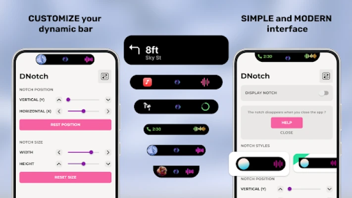 Разгърнете пълния потенциал на Dynamic Bar с изключителни функции, създадени за вас. Насладете се на адаптивен и напълно персонализируем дизайн, който ви позволява да настроите размера, позицията и видимостта според индивидуалните си предпочитания. Добавете Dynamic Bar Widget към началния си екран за бърз достъп до основни функции и преки пътища към приложения. С Dynamic Spot ще бъдете винаги информирани, тъй като тази гъвкава зона за показване представя важни известия и съответни детайли по елегантен начин. Потопете се в завладяващия визуален ефект на Dynamic Bar, предлагащ върхови постижения в динамичната дисплейна технология.